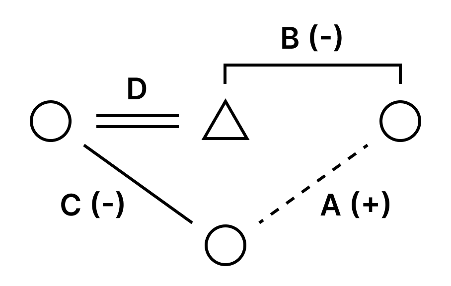 The edges represent relationships, which may be either **warm** (**+**) or **cold** (**–**).