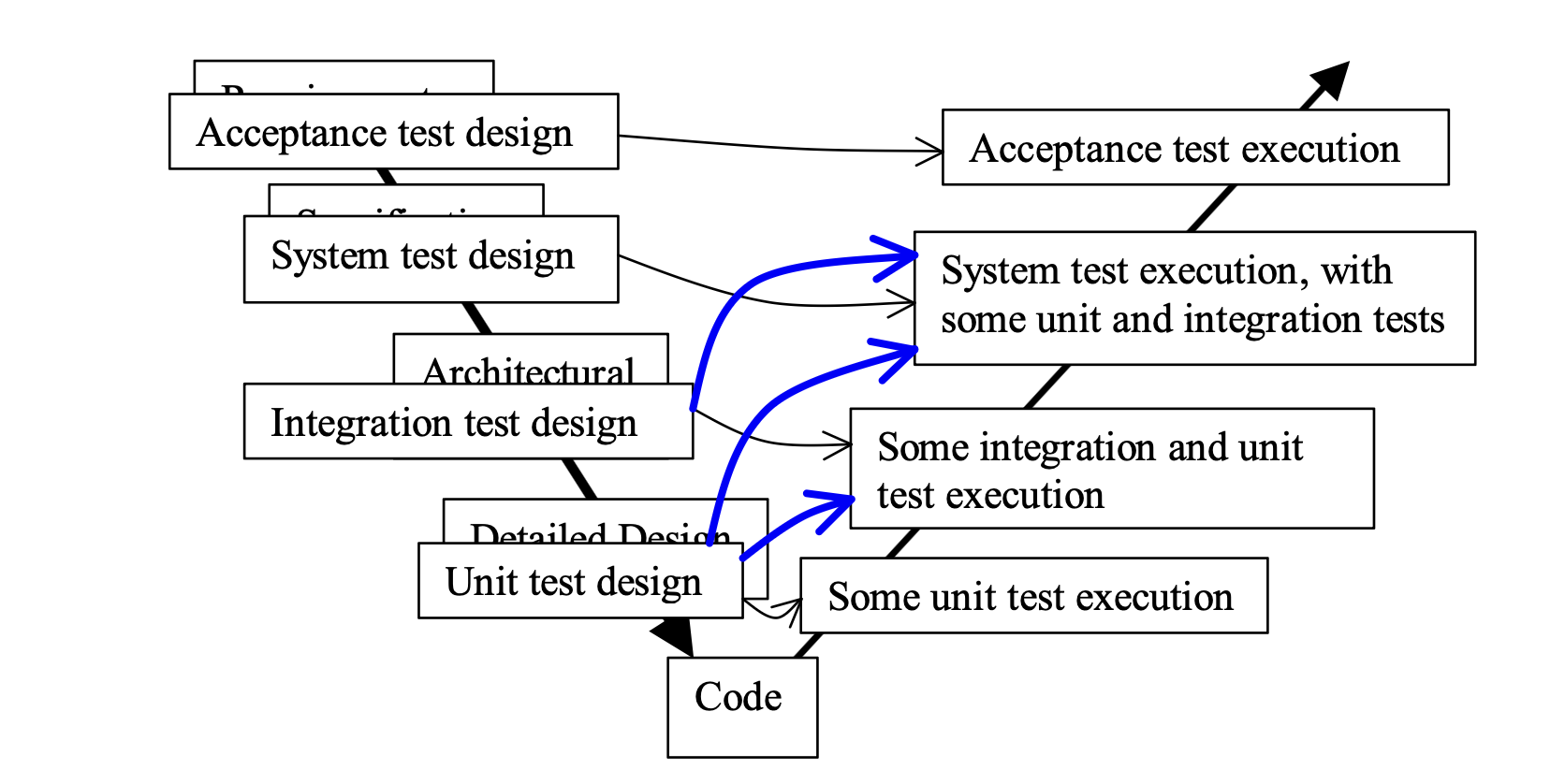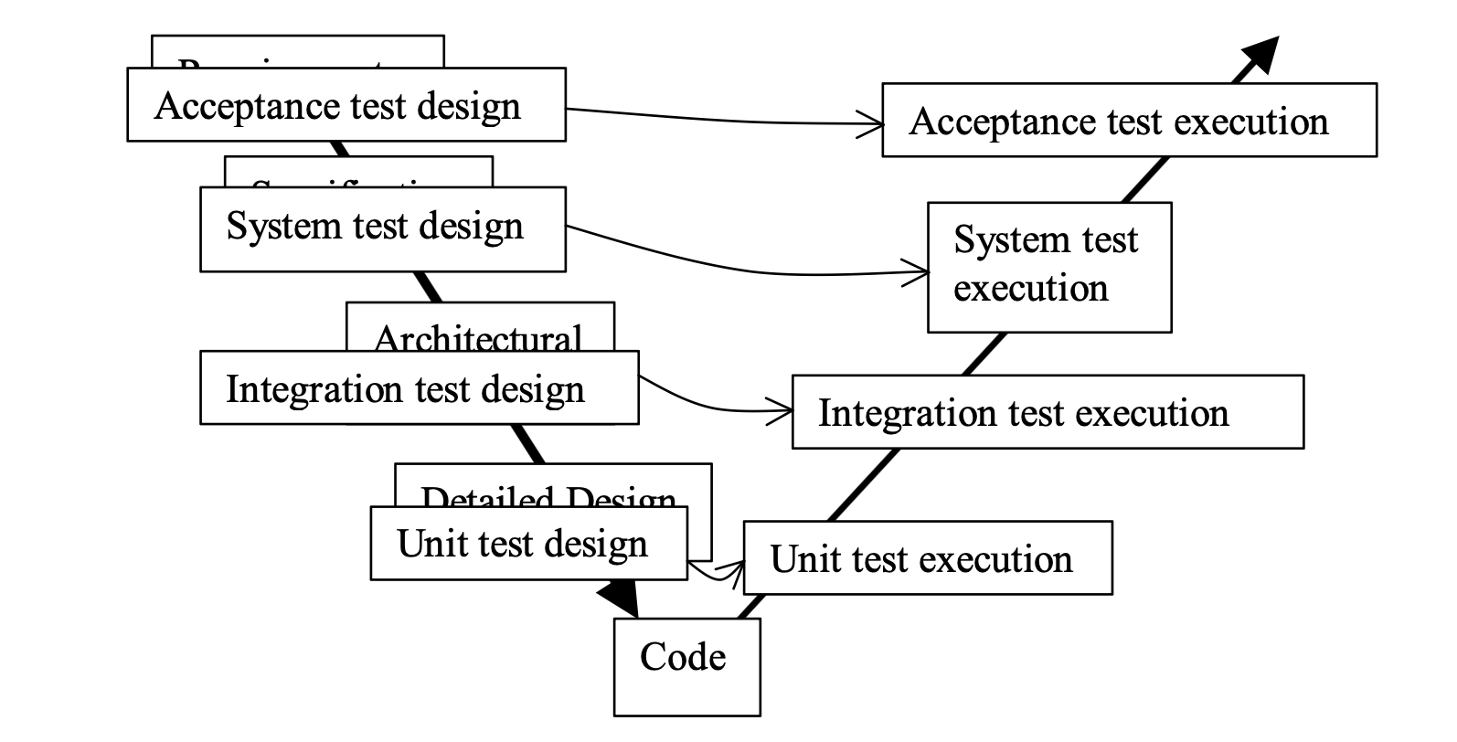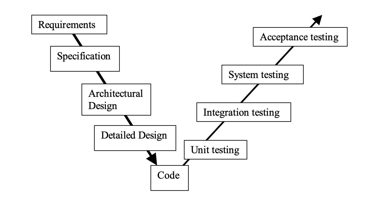The V model ties a particular kind (and phase) of testing to waterfall-model phases. Note the pleasing symmetry.