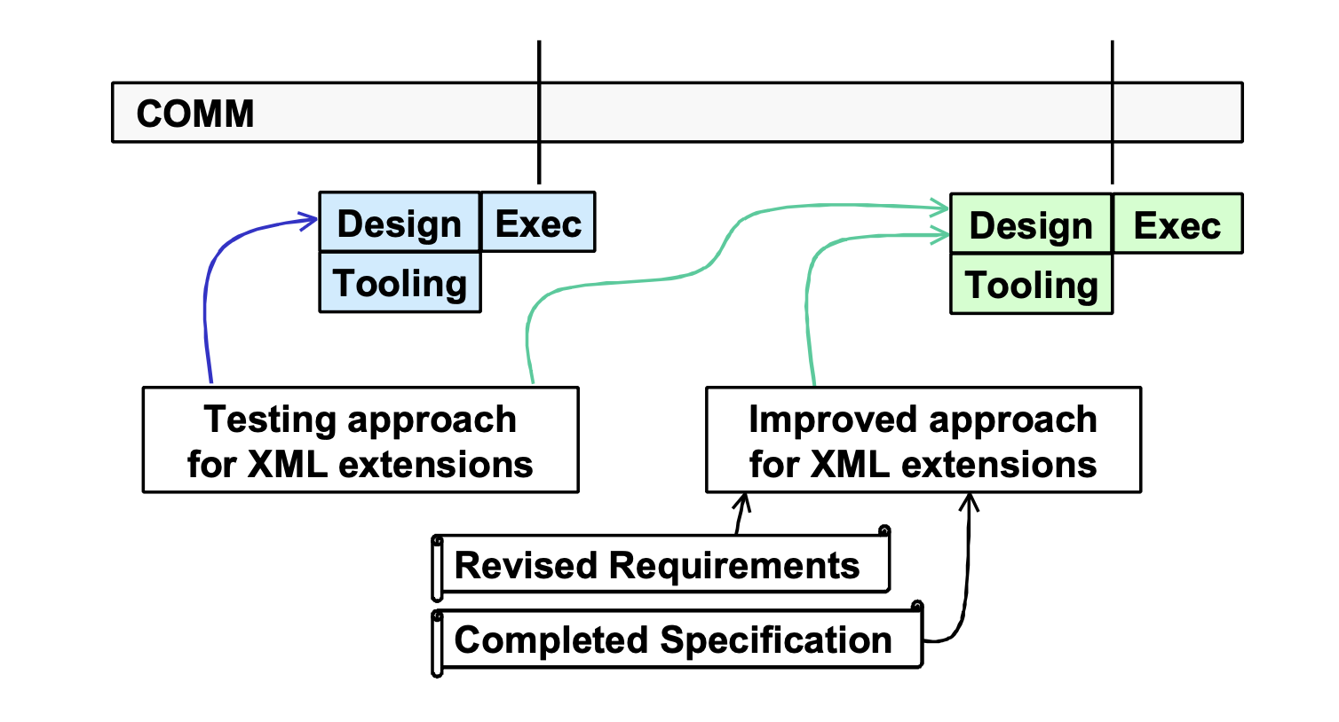 I proposed abandoning the prettily symmetrical test phases, and also ignore development phases. Rather, prescriptive statements about artifacts to be developed would be harvested whenever available and convenient. They essentially form an ever accumulating pile of "check this" commands.