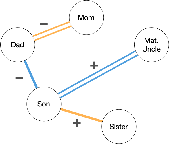 Claude Lévi-Strauss's kinship diagrams feature **+/–** annotations to indicate whether a relationship is "warm" or "cold":